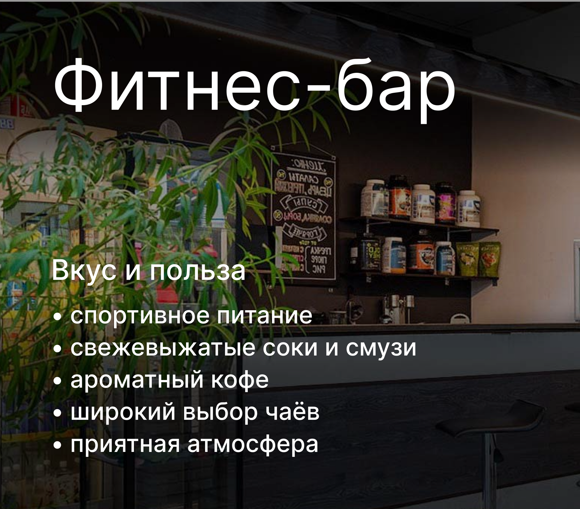 В фитнес-центре представлен самый большой в ЮАО тренажерный зал (1000 м²), студии групповых программ, зона единоборств, spa, сауны. Квалифицированный персонал всегда готов помочь гостям клуба подобрать оздоровительную программу, скорректировать план тренировок и привести к скорейшим результатам